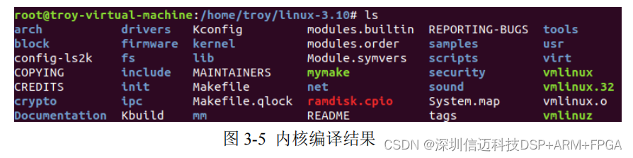 图 3-5 所示编译完毕之后在内核目录下生成 vmlinux 为可移植的 Linux 内核镜像,