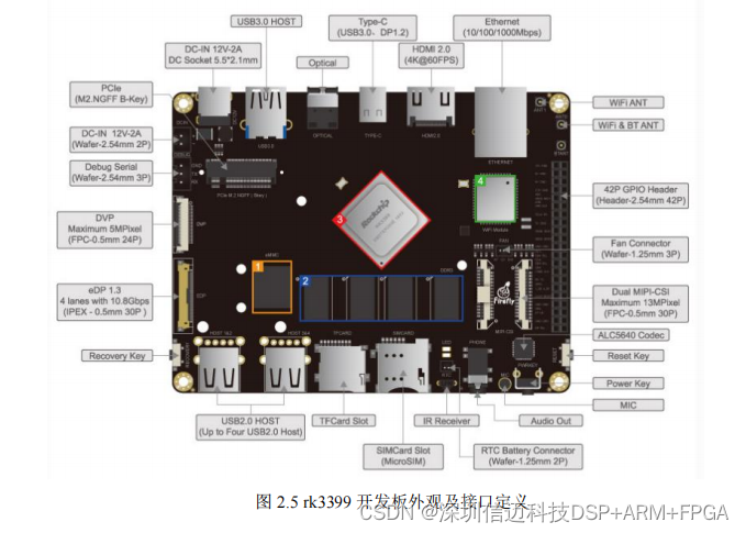 在硬件接口上,rk3399 提供了大量的资源,信迈RK3399开发板外观和具体接口定义如图 2.5 所