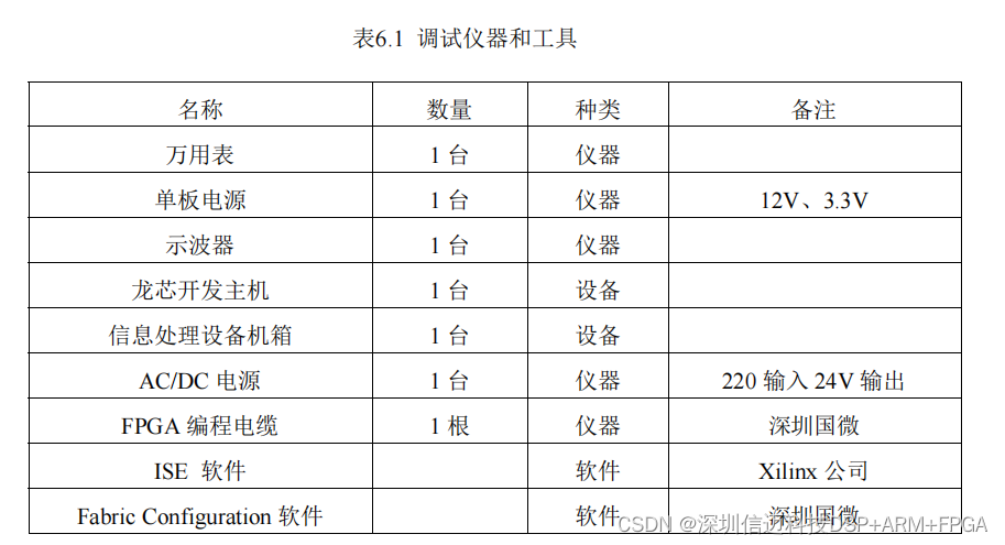 单板硬件调试需要使用示波器、万用表、单板电源;软件调试需要国微 FPGA 下