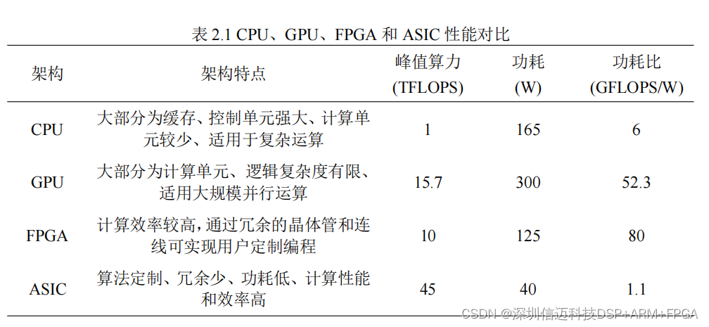 芯片可选架构有 GPU、FPGA、ASIC 等,其性能对比如表 2.1 所示。