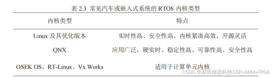 要求。目前应用在汽车或嵌入式系统中的 RTOS 内核类型如表 2.3 所示。