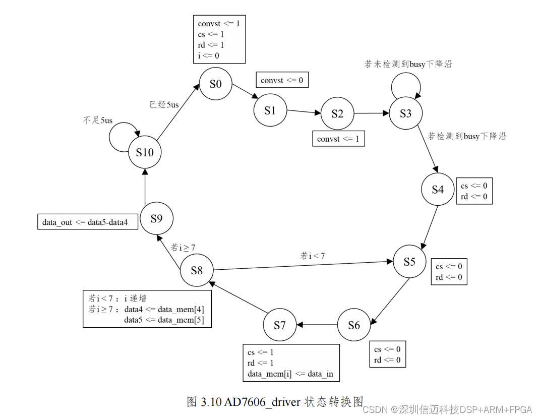 状态转换图如图 3.10 所示。选用最高的采样率 200k,所以一个循环为 5us。