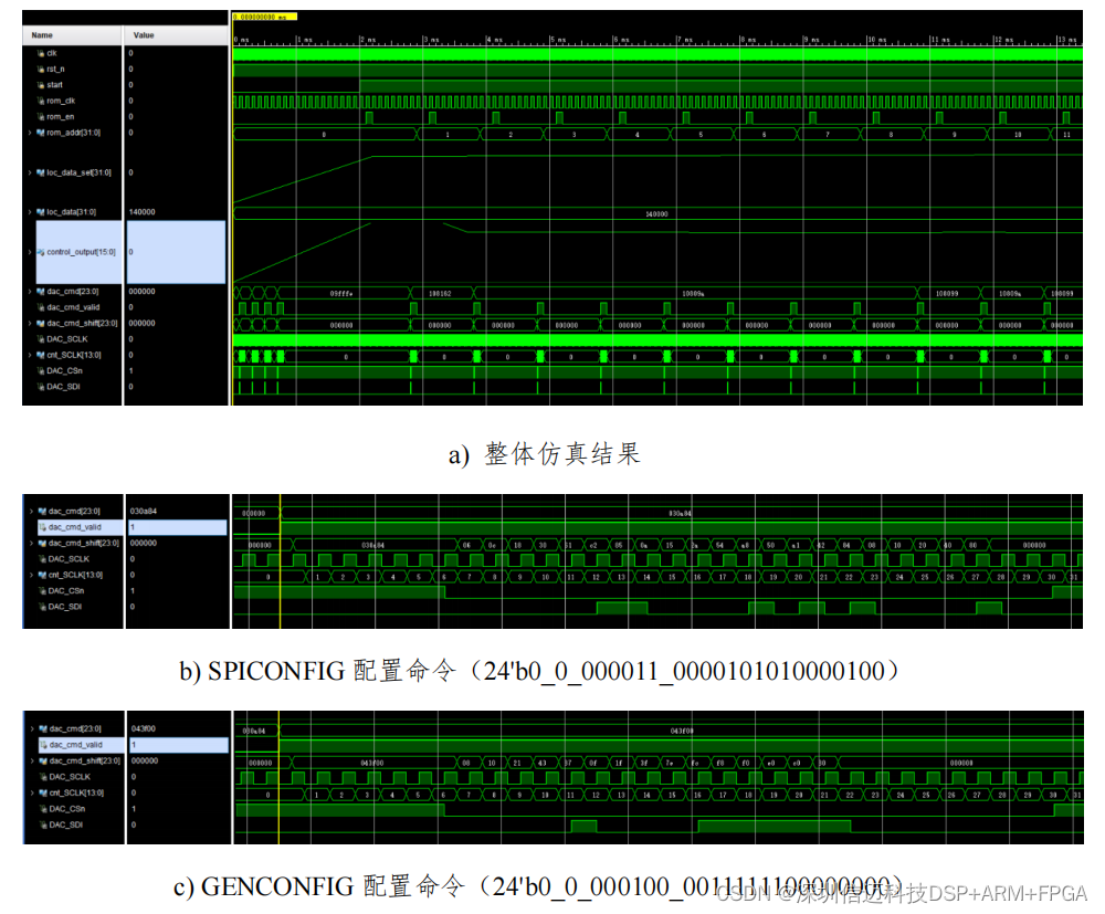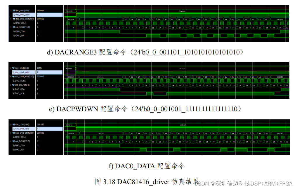 DAC81416_spi 子模块的作用是将并行的 dac_cmd 转化为 SPI 串行信号。值