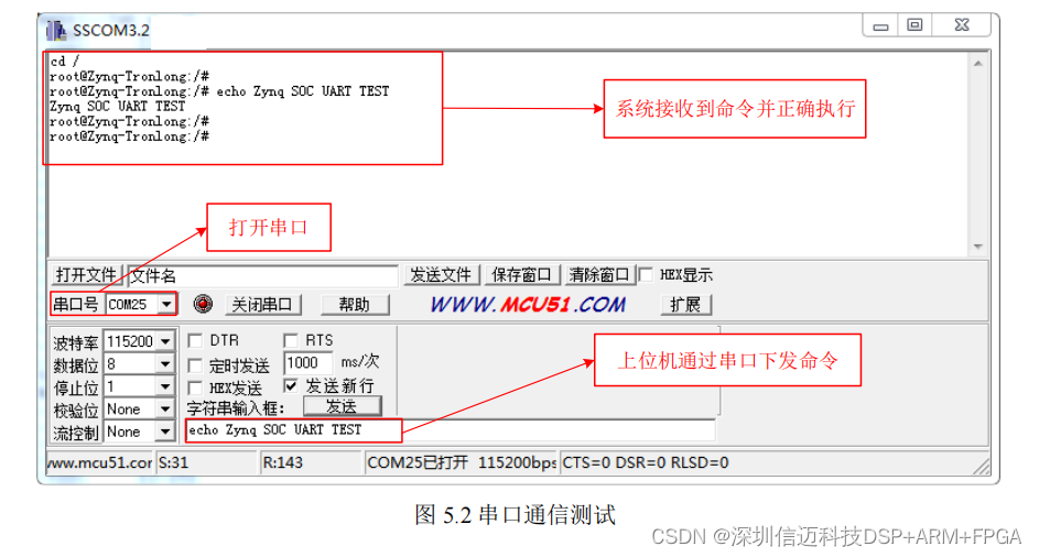 通过 UART 接口将控制平台和 Windows 主机进行连接,使用 SSCOM3.2 软件进