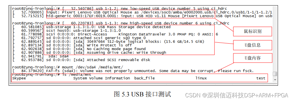 标连接,将接口 USB1 与 U 盘连接。测试结果如图 5.3 所示,Linux 系统正确识别到