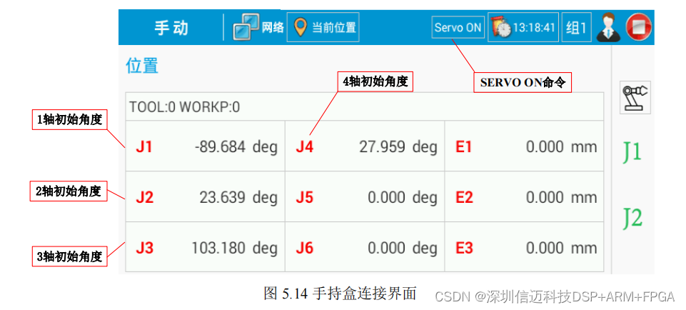 动平台四轴的初始位置。如图 5.14 所示,手持盒软件读取到四轴的初始角度,与机