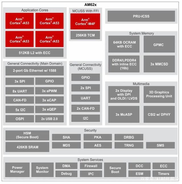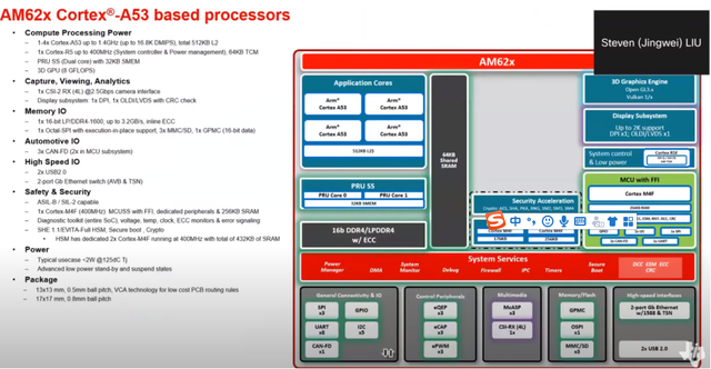为了便于理解AM62x,刘靖伟提供了一份AM335x与AM62x的详细对比框图,共计8大差异。AM335x是TI经典的工业MPU,它引领了一个时代,即工业市场从MCU向MPU演进,帮助产业界从Arm9迅速迁移至高性能Cortex-A8处理器。