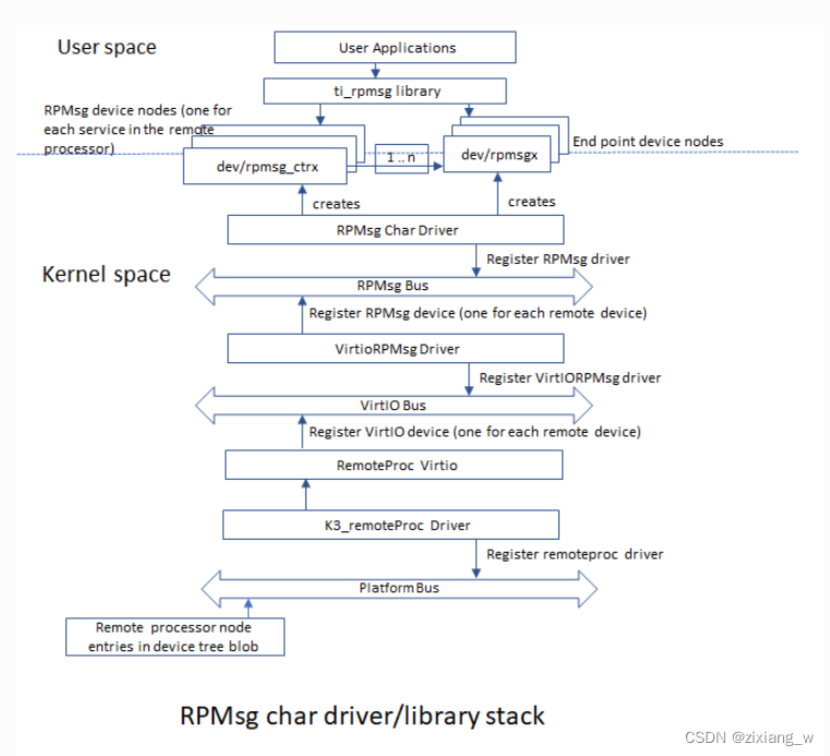 RPMsg字符驱动程序提供控制接口(在/dev/rpmsg_ctrlX下以字符设备的形式),允许用户空间为每个公开的端点导出端点接口。控制接口提供专用的ioctl来创建端点设备。
