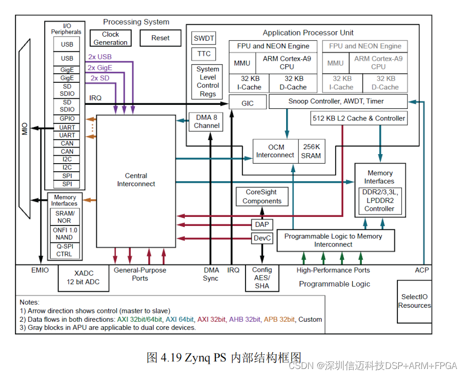 它们分别是:1、应用处理器单元(APU);2、AXI 接口(PS-PL);3、存储器接口;4、