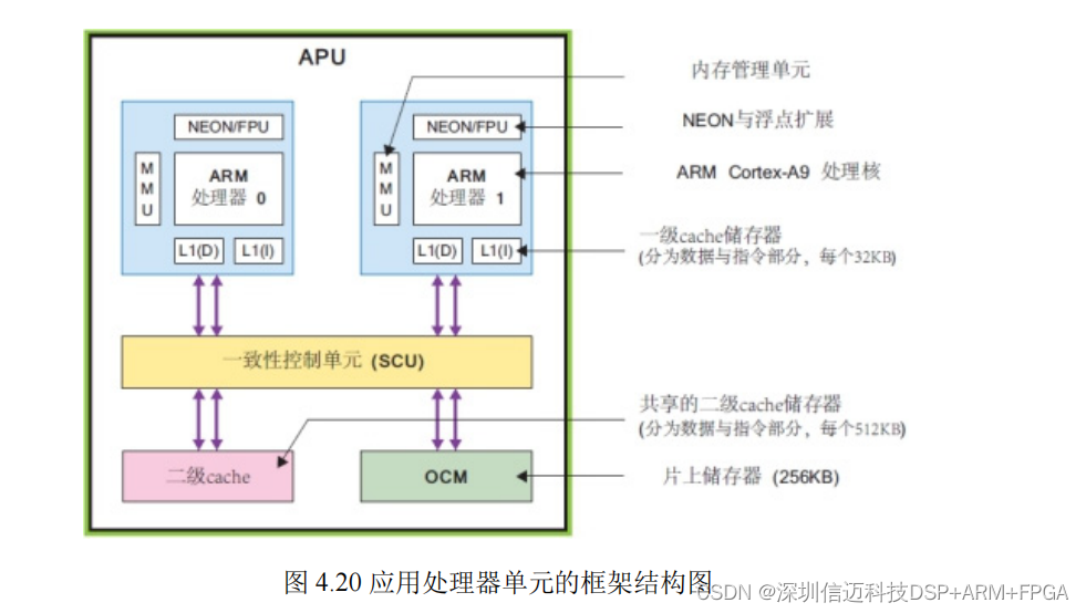 从该图中可以看出,应用处理器单元中包含了两个 ARM Cortex A9 处理器,每个处