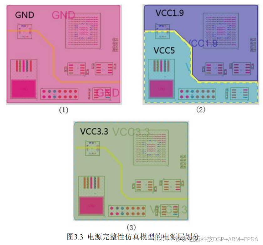 如图 3.3 所示,该模型的电源层一共划分为 3 层:第(1)层为完整的地平面;