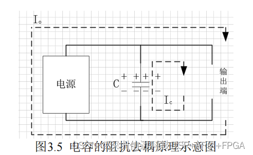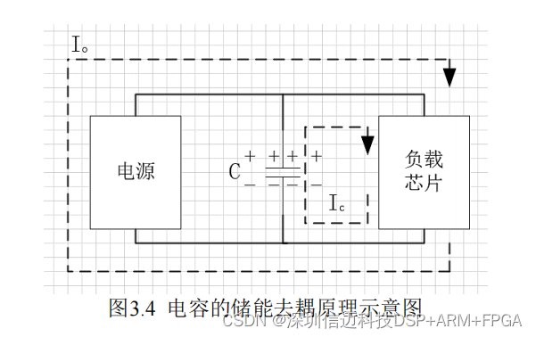 图 3.4 给出了电容的储能去耦原理,C 为电源芯片外放置的去耦电容组合。当负