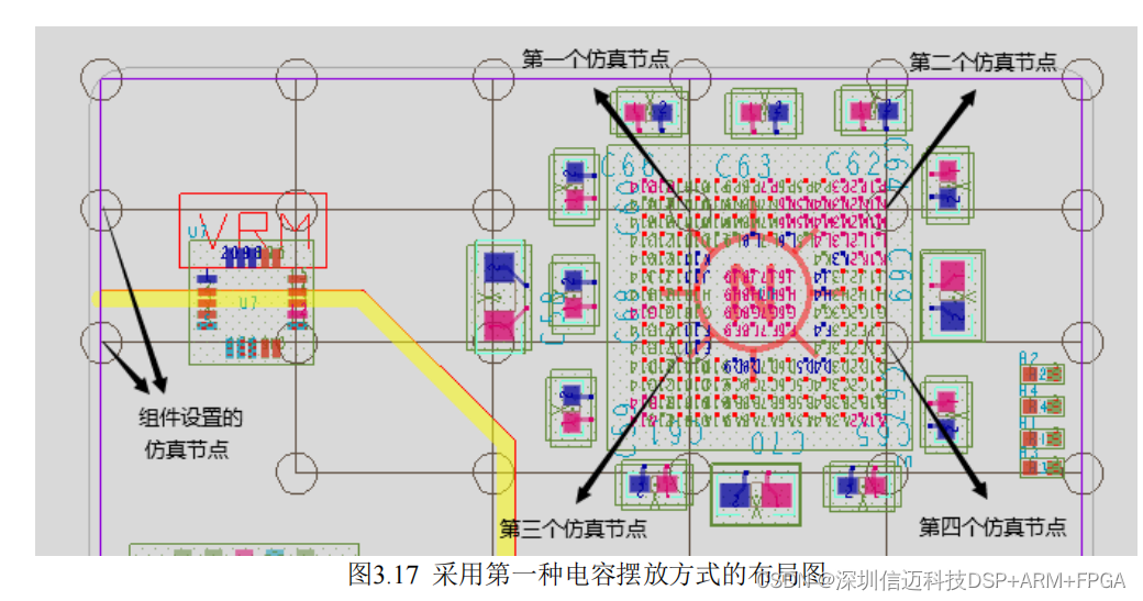 而大电容则适当远离 DSP 芯片放置,这种电容布局方式如图 3.17 所示。同时可以看