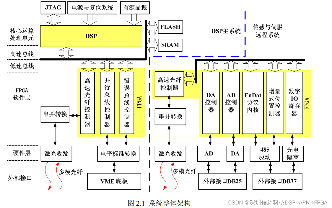 核心运算处理单元 DSP 主系统和传感与伺服远程系统之间采用多模光纤介质进行