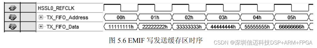 图 5.12 所示,通过 EMIF 异步接口对高速串行光纤通信内核的发送缓存区写一系列