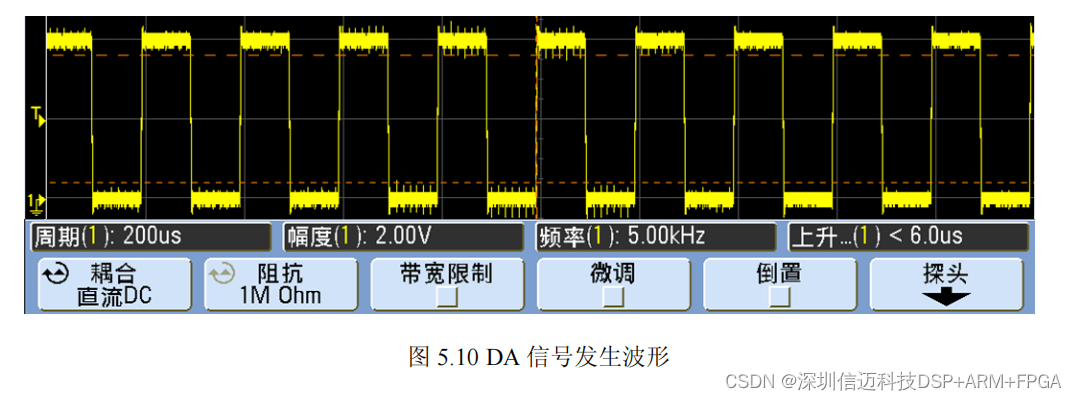 拟电压信号应为 0V、1.99999V 两个电压值,周期为 200us 的方波。图 5.10 所示为示波