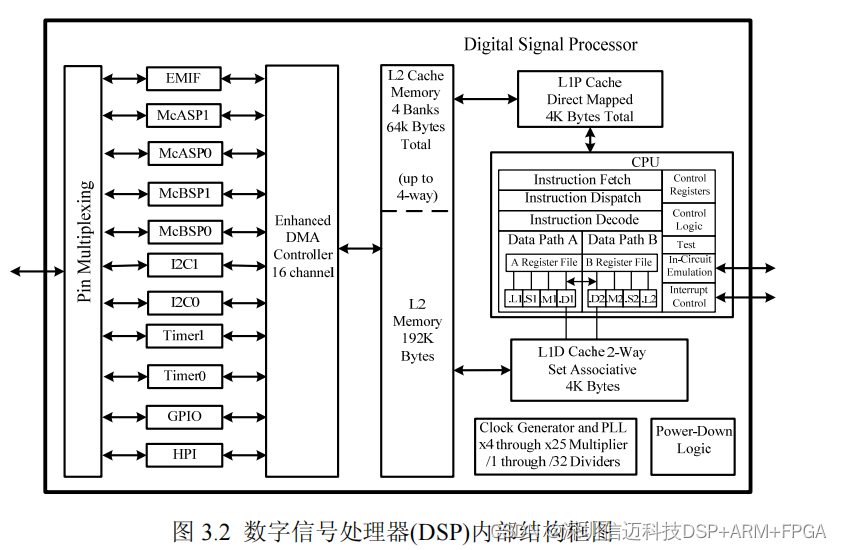 (2)采用二级缓冲处理,4KByte 直接匹配的程序缓冲 L1P,4KByte 可匹配
