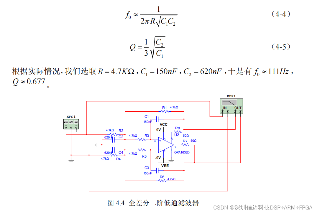 如图 4.4 所示,OPA1632 设计成二阶巴特沃斯低通滤波器,通频带宽根据设计要