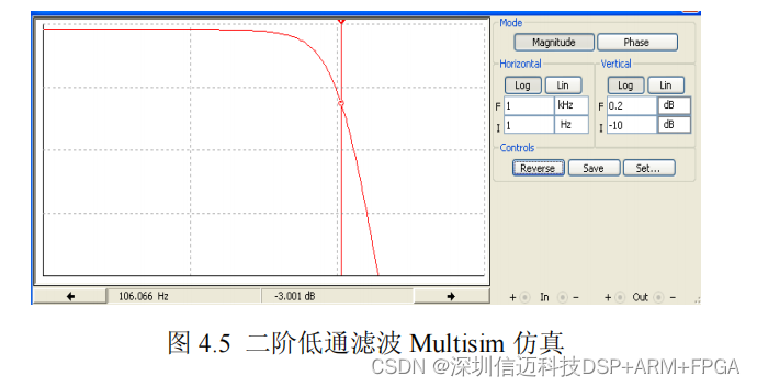 如图 4.5 所示,是该低通滤波器的 Multisim 仿真波特图。由图可知,该滤波器