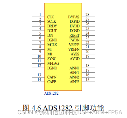 ADS1282 采用 28 引脚贴片 TSOP 封装,引脚功能如图 4.6 所示。