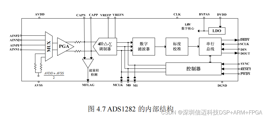 ADS1282 的内部结构如图 4.7 所示,主要由多路选择器(MUX)、可编程增