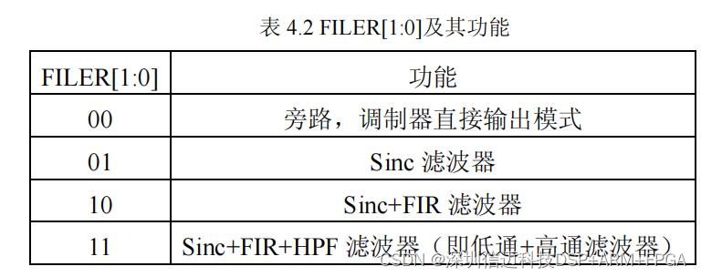 数字滤波器的选择是由 FILER[1:0]位来决定,如表 4.2 所示。