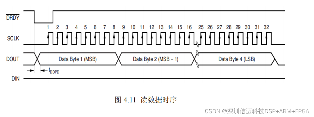 在 SCLK 的上升沿移入 DIN,在 SCLK 的下降沿移出 DOUT。DRDY 是输出信号,