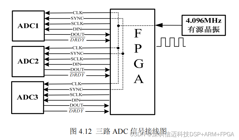 图 4.12 所示,每个 ADC 的通信接口有主时钟 CLK、同步信号 SYNC、串行总线