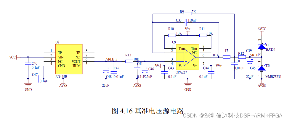 容滤波后输入到运算放大器中。该运放设计为跟随器,可以增强基准电压的输出