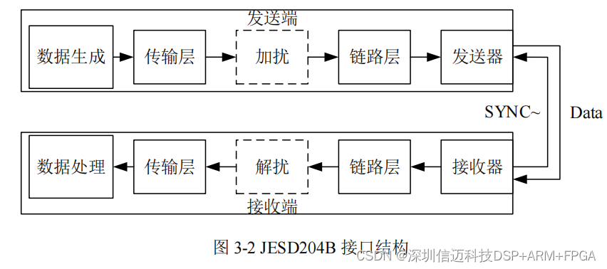 3-2 是 JESD204B 接口结构框图,发送端与接收端之间对应层级在功能上互为逆过