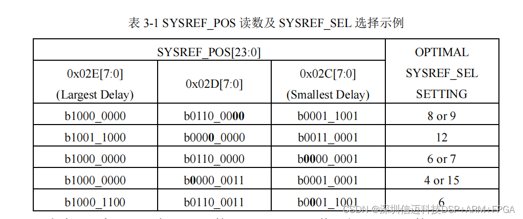 据 SYSREF_POS 数值选择 SYSREF_SEL 位置的示例如表 3-1,加粗部分表示可以