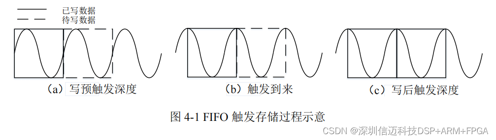 发存储的最大不同在于触发的控制。FIFO 在预触发深度满至触发信号到来的这段