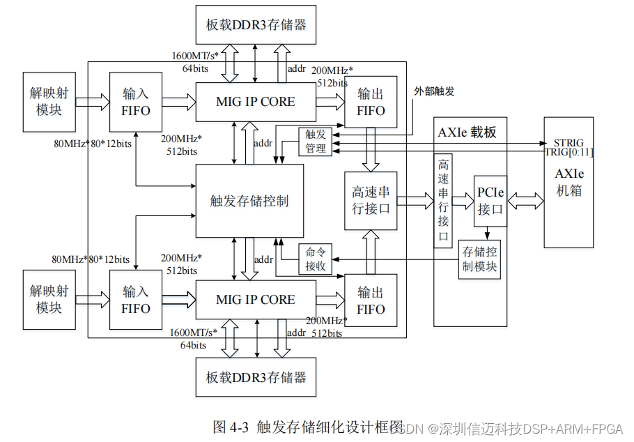 触发存储控制模块设计。基于 MIG 核存储逻辑设计包括了 MIG 核的读写逻辑设计