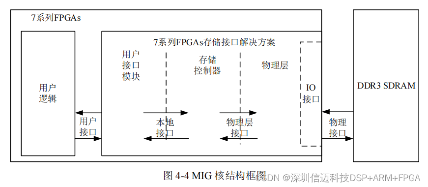 MIG 核结构框图如图 4-4 所示,由用户接口模块(User Interface Block)、内存控