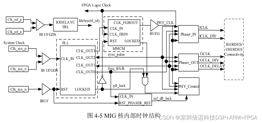与时钟相关的设置尤为重要,因此有必要了解 MIG 核内部时钟结构。图 4-5 为 MIG