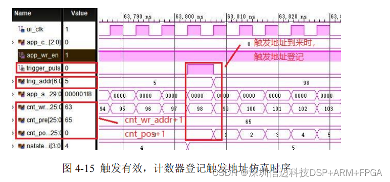 址即为触发地址。如图 4-15 所示为等待触发过程计数器计数及触发地址登记仿真