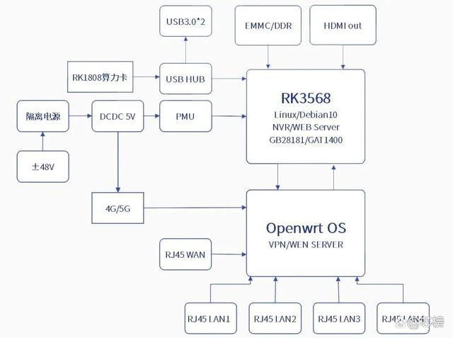 1)RK3568主控+RK1808算力卡架构+硬路由芯片的智能边缘网关方案,支持Debian和OPENWRT操作系统,可灵活支持1T算力到4T算力扩展应用