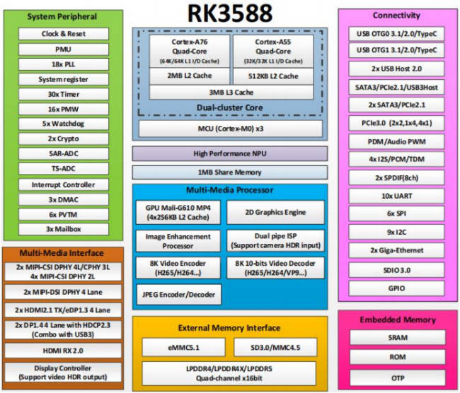 RK3588 是一款低功耗、高性能的处理器,适用于基于 arm 的 PC 和 Edge 计算设备、个人移动互联网设备等数字多媒体应用,采用 8nm 结构,将四核 Cortex-A76 和四核 Cortex-A55 分别与 NEON 集成在一起。RK3588 支持 8K、60fps 解码,拥有高质量的 JPEG 编码器/解码器,专业的图像预处理器,内置 GPU 可以完全兼容 OpenGLES 1.1、2.0 和 3.2。RK3588 引入了 新一代 完全基于硬件的最大 4800 万像素 ISP,内置 NPU,支持 INT4/INT8/INT16/FP16 混合运算能力,支持安卓 12 和 linux 系统。瑞芯微 RK3588 功能框图,如下图所示: