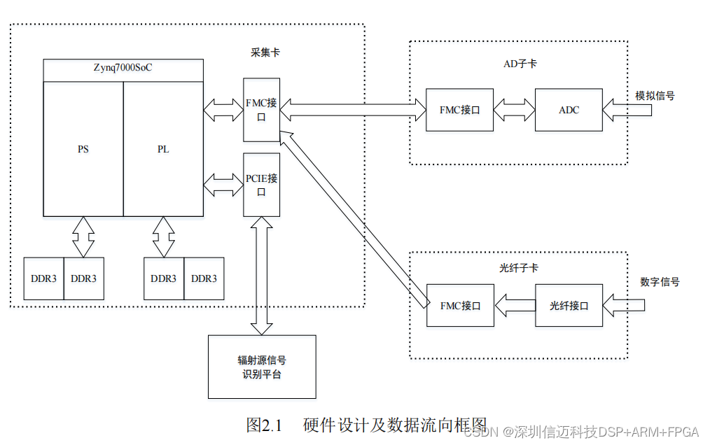 的高速数据经 FMC 接口进入 Zynq 芯片,再经 PCIE 接口传输至辐射源信号识别平台