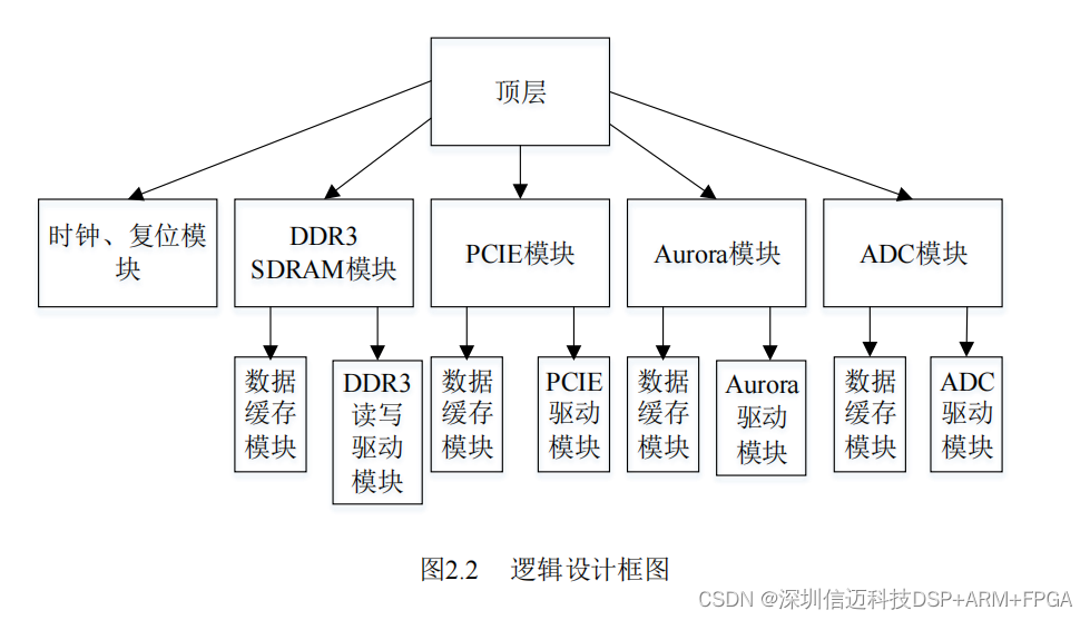 块,其他模块由各自的驱动模块和数据缓存模块组成,其中数据缓存模块为 FIFO 接口,方便各模块之间的连接。逻辑设计框图如图 2.2 所示。