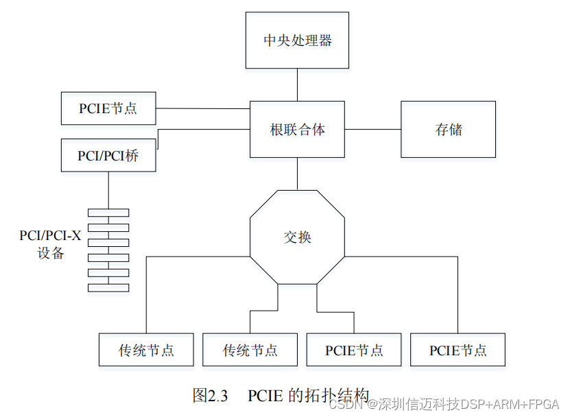 PCI Express-PCI Bridge,以实现与 PCI 设备的通信。PCIE 的拓扑结构如图 2.3 所示: