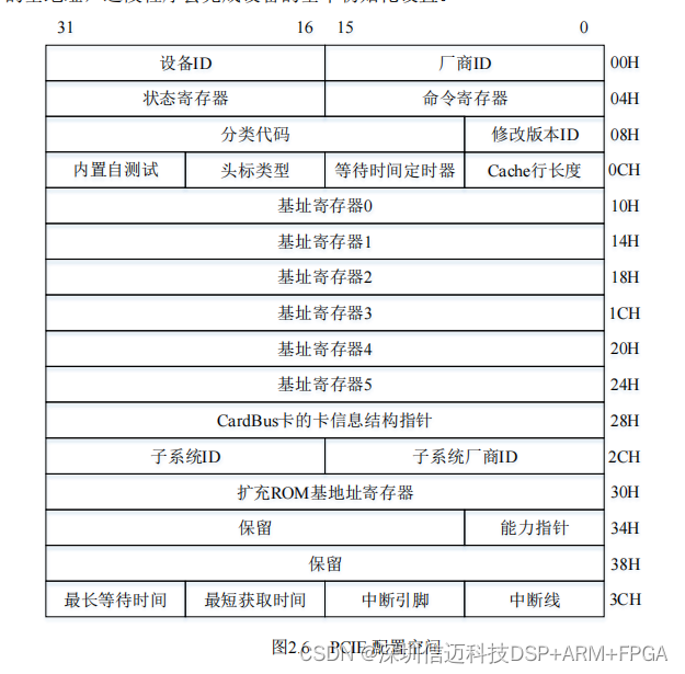 可以向下兼容 PCI 设备[22]。PCIE 配置空间如图 2.6 所示。其中设备 ID、厂商 ID、分