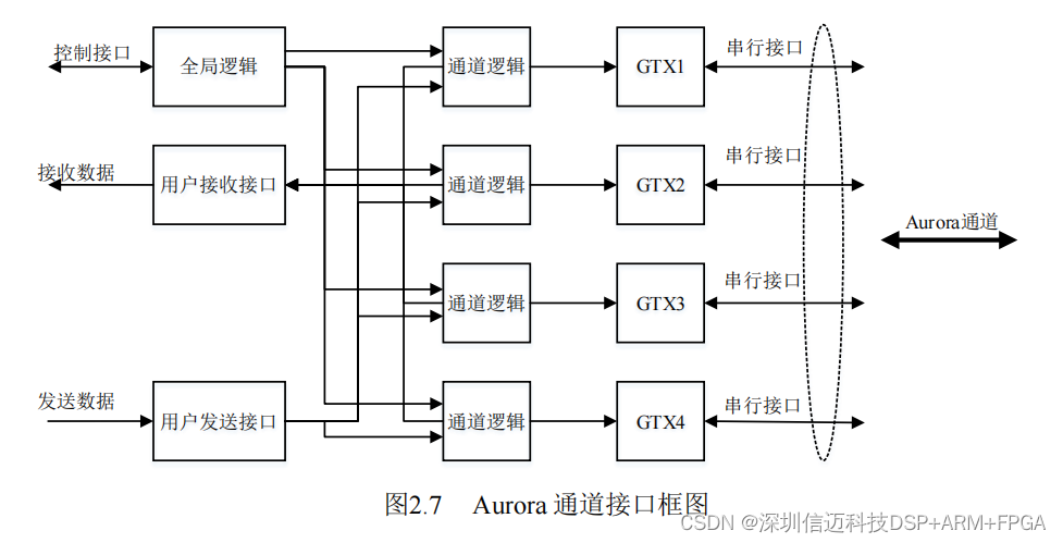 获得更高的数据传输速率。在发送端,用户通过接口(通常为 AXI 接口)与 Aurora
