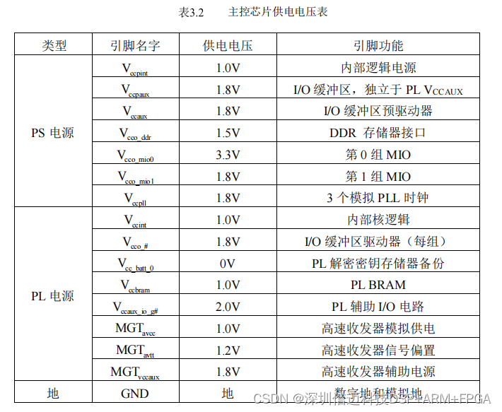部分需要内部电压、辅助电压、MIO 电压等。其中 PL 部分和 PS 部分供电电压如表
