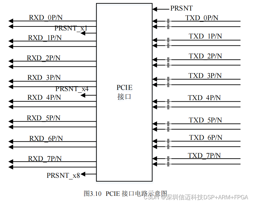 PCIE 接口电路示意图如图 3.10 所示,图中箭头代表数据方向,RXD 是接收引