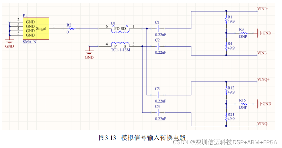 ADC 芯片电压采用差分输入的形式,本次设计为模拟信号以交流耦合的方式进