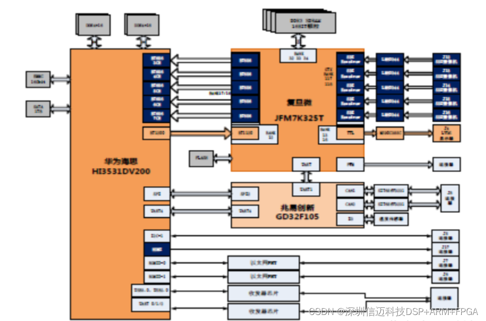 XM714是自主研制的一款5路HD-SDI视频采集图像处理平台,该平台采用上海复旦微的高性能Kintex系列FPGA加上华为海思的高性能视频处理器HI3531DV200来实现。 华为海思的HI3531DV200是一款集成了ARM A53四核处理器性能强大的 神经网络 引擎,支持多种智能算法应用,集成多路MIPI视频接口,突破了数字接口视频输入的性能瓶颈,高性能的H.265视频编解码引擎,使得传统视频图像处理的算法效果和性能得到进一步的提升。 板载功能强大的FPGA处理器,主要完成视频图像的预处理算法,板载1GByte超大容量的DDR3 SDRAM数据缓存,最大支持12GByte/s的内存带宽,突破了传统视频图像处理带宽的瓶颈。FPGA外部支持5路SDI视频图像输入、支持1路LVDS视频图像输出。