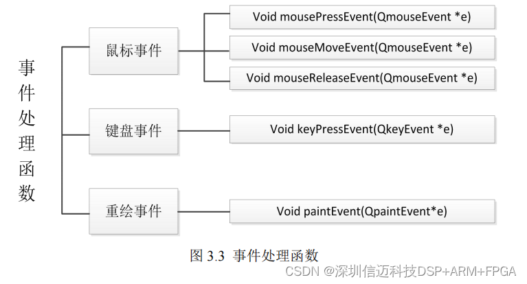 去触发。比如鼠标操作和键盘的键入。这些操作在 Qt 中都有对应的函数来响应。图 3.3