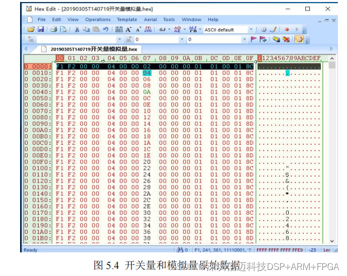7. 开关量和模拟量测试结果如图 5.4 所示。数据帧头 F1F20000,频率 100Hz,帧计