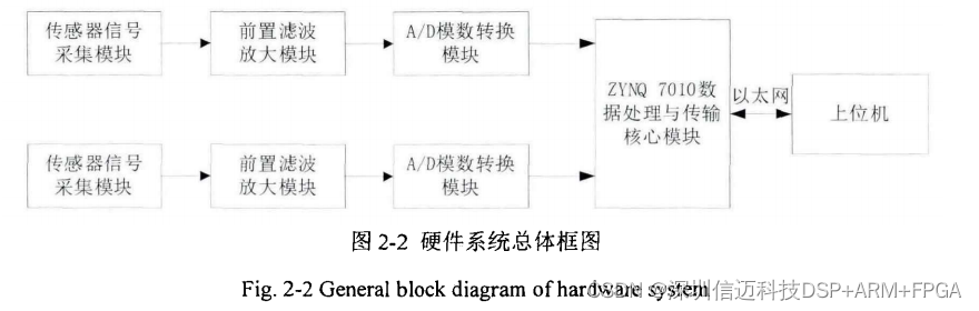 大 模块 A / D 模 数转换模块 和 Z YN Q 7 0 1 0 数据 处 理 与 传输 核 心 模 块 四 大 模块 , 硬件 系 统 总 体 设计框 图 如 图 2 - 2 所示 ,后 续将对 每 一 个 模块 的 需求进 行 详 细 分 析 完 成硬件 系 统 的 模块选 型 。